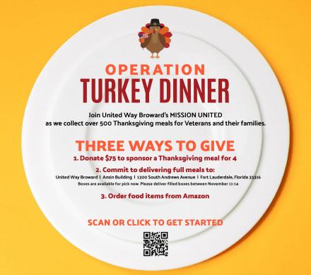 Operation Turkey Dinner – Meals for Veterans and Families   United Way Broward's MISSION UNITED is hosting the 2025 Operation Turkey Dinner on Wednesday, November 19, from 3–5 PM. This annual event provides over 800 Thanksgiving meal kits to Veterans and military families in Broward County, ensuring they have everything needed for a…