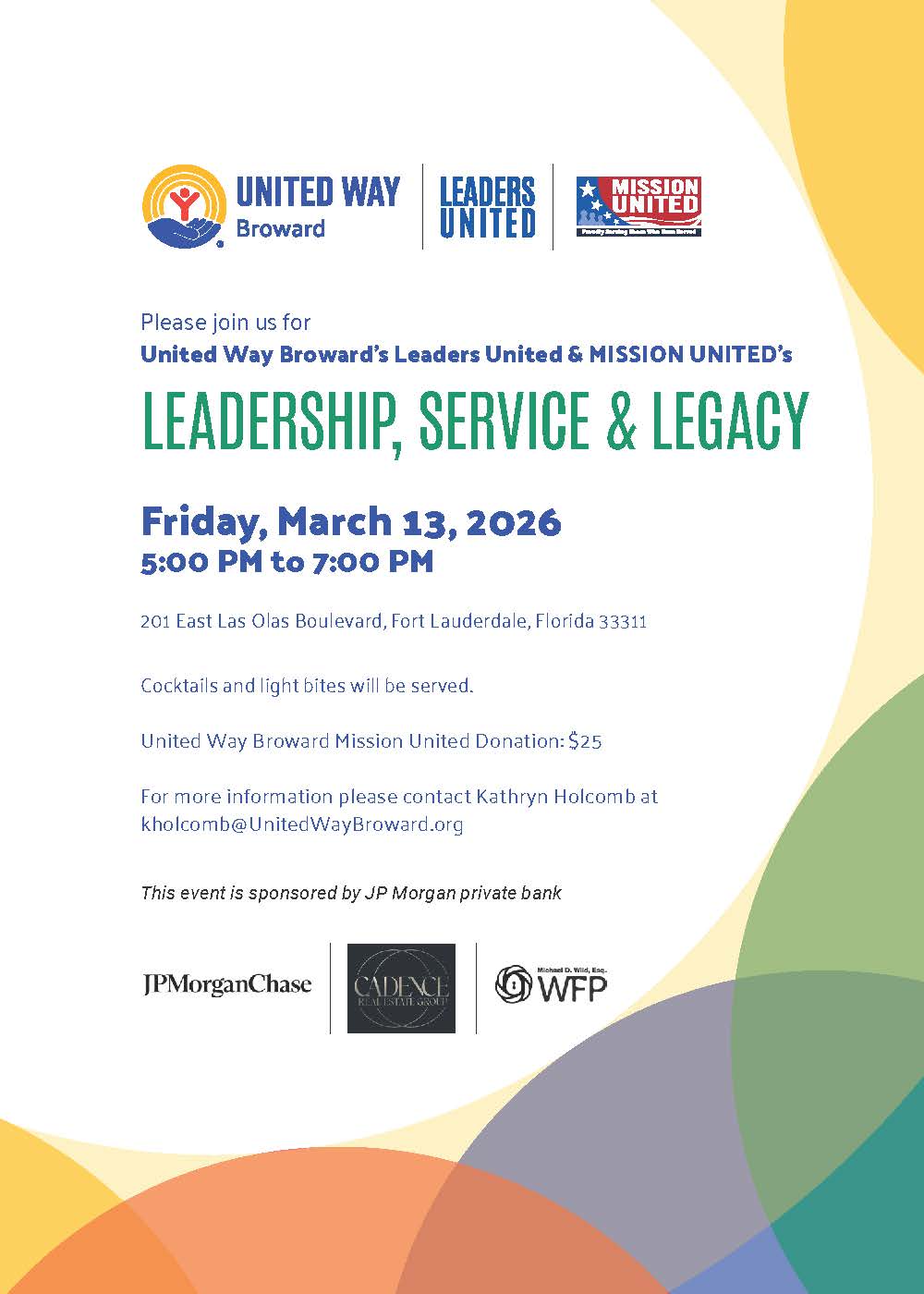 Join United Way Broward’s Leaders United and MISSION UNITED for an evening dedicated to leadership, service, and lasting impact.