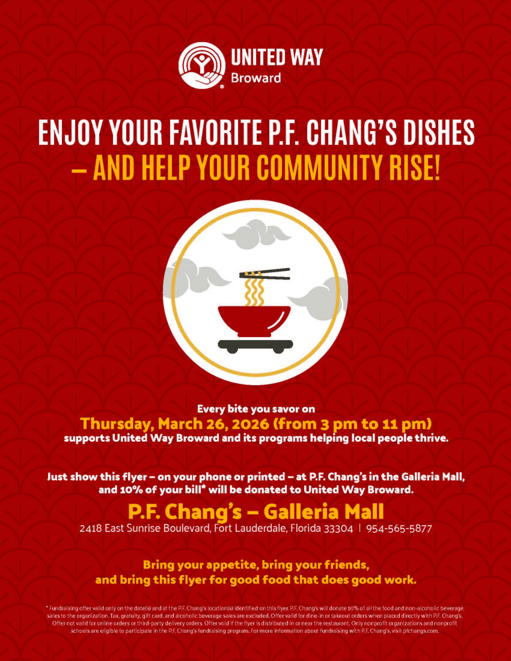 On Thursday, March 26, enjoy your favorite P.F. Chang’s dishes at the Galleria Mall location and support United Way Broward at the same time. When you present the flyer, 10% of your bill will be donated to programs helping local people thrive.